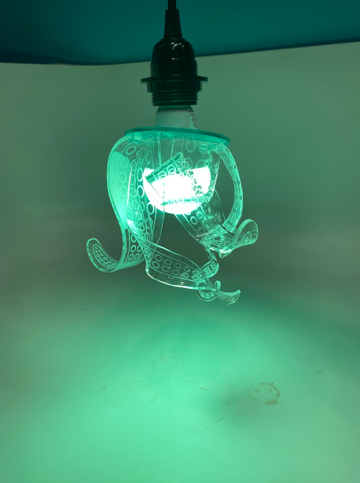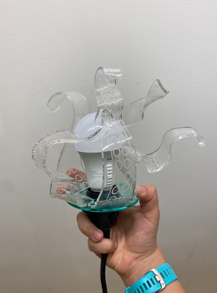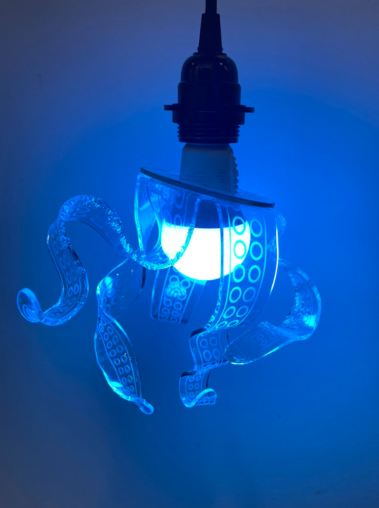 For this project, I repurposed scrap acrylic and used a laser cutter to cut tentacles. To add some movement, I warped the pieces into flowing, wavy shapes using a toaster oven and a heat gun. Finally, I placed a color-changing bulb at the center, creating a unique, ocean-themed lamp.